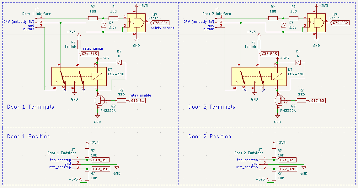 We recently moved into a house that had dumb garage doors, its the first house I have lived in that had any sort of garage door and it came with a level of worry that they would be left open at some point. It was also inconvenient to need to share 2 remotes between 4 different people. I decided to make a little module to control the doors and have positional sensors on them to remotely see if they were open or closed.